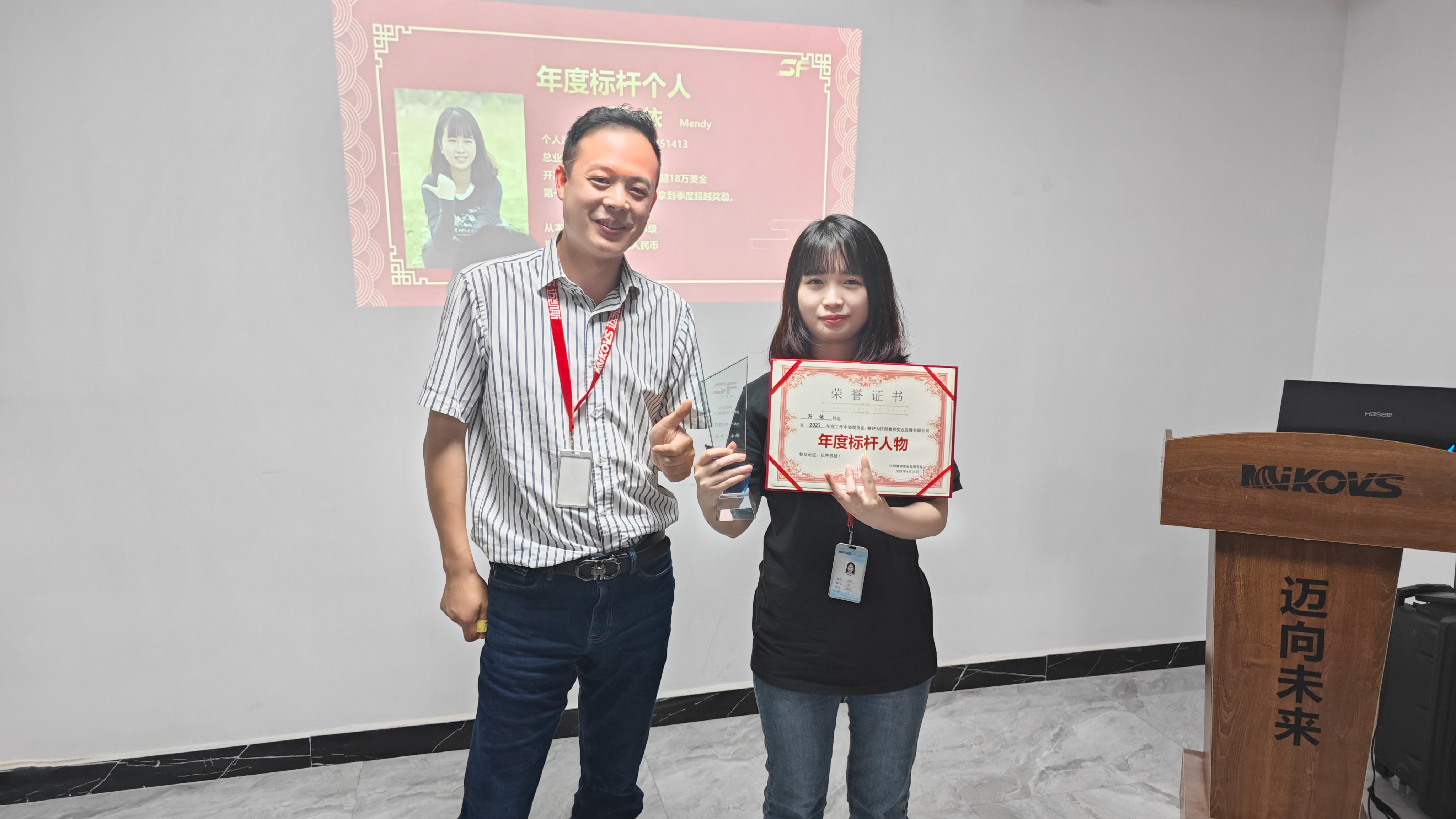 图为赛弗团队气质美女销冠万依,由于在2023-2024年度表现特别突出被评为年度标杆个人,并由迈