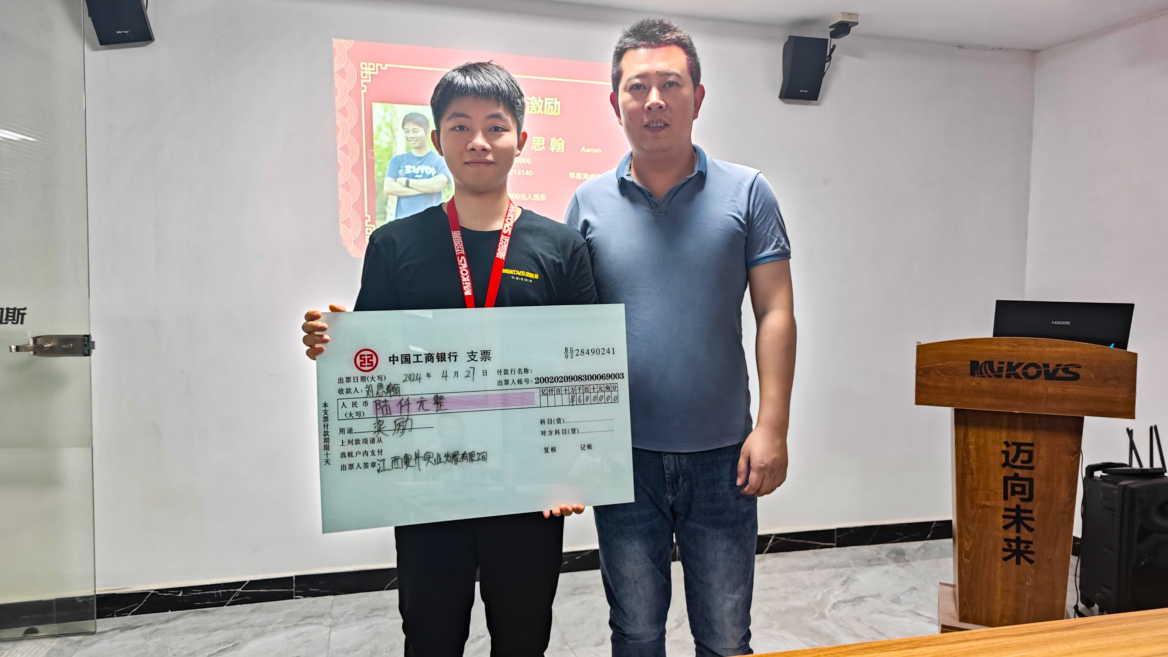 图为迈凯斯赛弗团队成员精神小伙刘思翰因超额完成年度目标,由赛弗团队邓总授予年度激励奖。